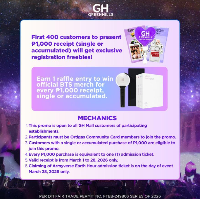 With a single or accumulated receipt worth ₱1,000, shoppers can lock in with an ARMY-core experience with DJ sets, BTS-inspired activities, and exclusive freebies. As the lights go down, the energy goes up! Get ready to raise your light sticks, sing your hearts out, and shine together in a symbolic switch-off for the planet.