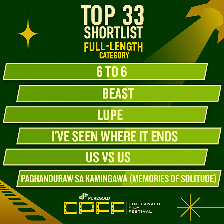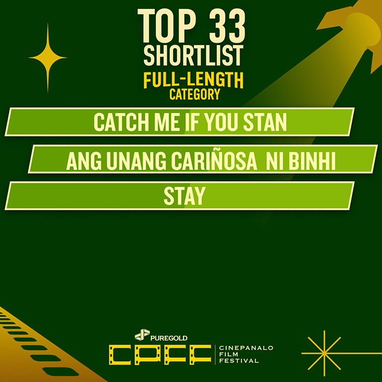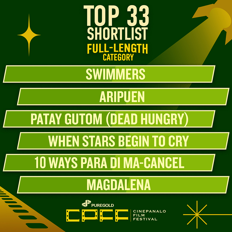 The Puregold CinePanalo Film Festival has announced the 33 short-listed full-length films from 203 entries submitted by emerging, established, and even iconic local filmmakers.